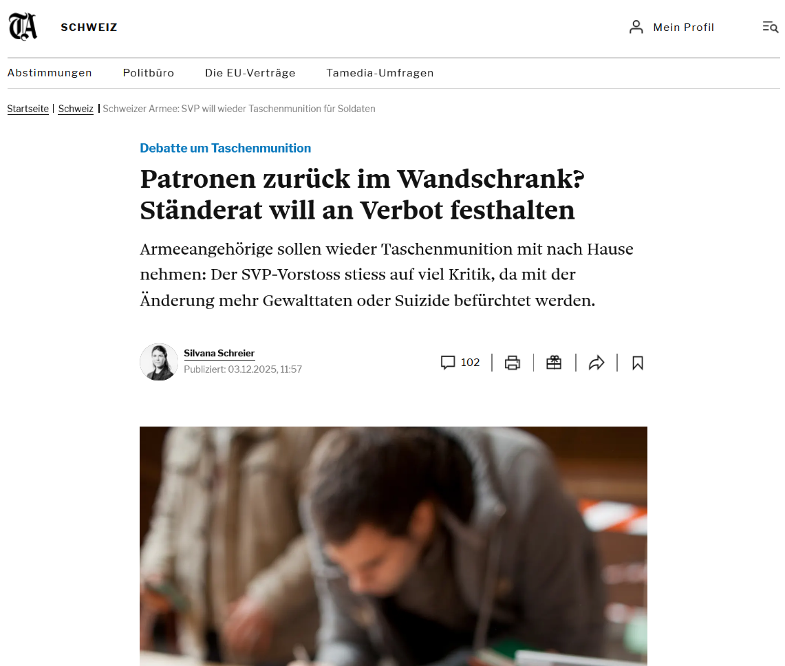 Umso absurder ist es, dass parallel politische Vorstösse diskutiert werden, die Munition wieder in die Haushalte bringen wollen. Die Wiedereinführung der Taschenmunition für Soldaten hätte das Risiko weiter erhöht. Zum Glück hat der Ständerat diese Idee seiner Sicherheitspolitischen Kommission in der Wintersession abgelehnt. Mehr Munition in Haushalten sind kein Beitrag zur Sicherheit, sondern eine Gefahr, besonders für Frauen.